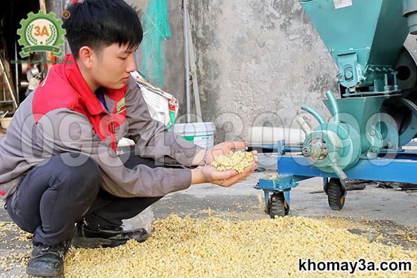 Khởi động máy và cho hỗn hợp đã trộn vào phễu nạp. Máy sẽ tự động ép và đùn ra những sợi cám dài. Máy có một dao cắt phía trước đầu ép sẽ cắt chúng thành những viên cám có độ dài phù hợp.